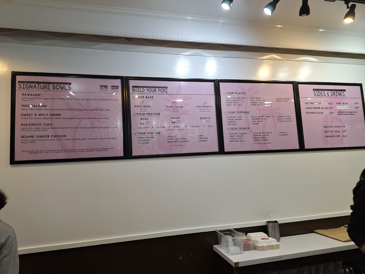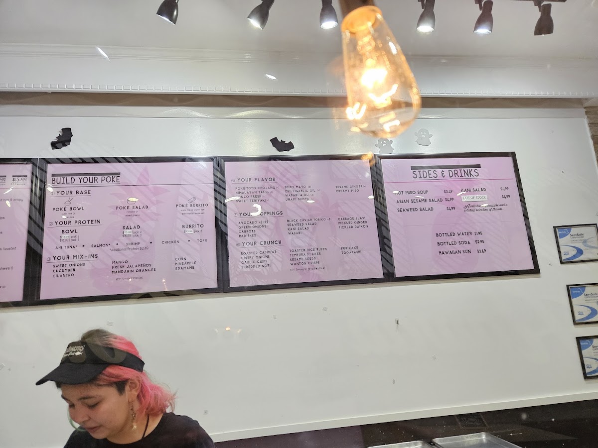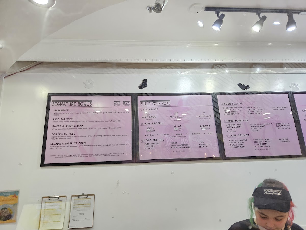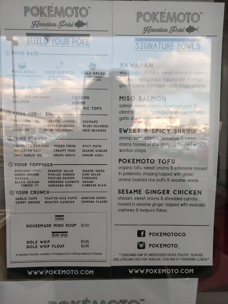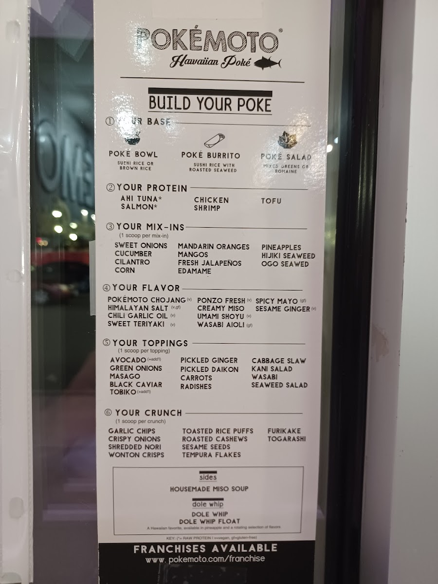 Create your own poké salad choose your base proteins, mix-ins, flavor, toppings, and crunch.