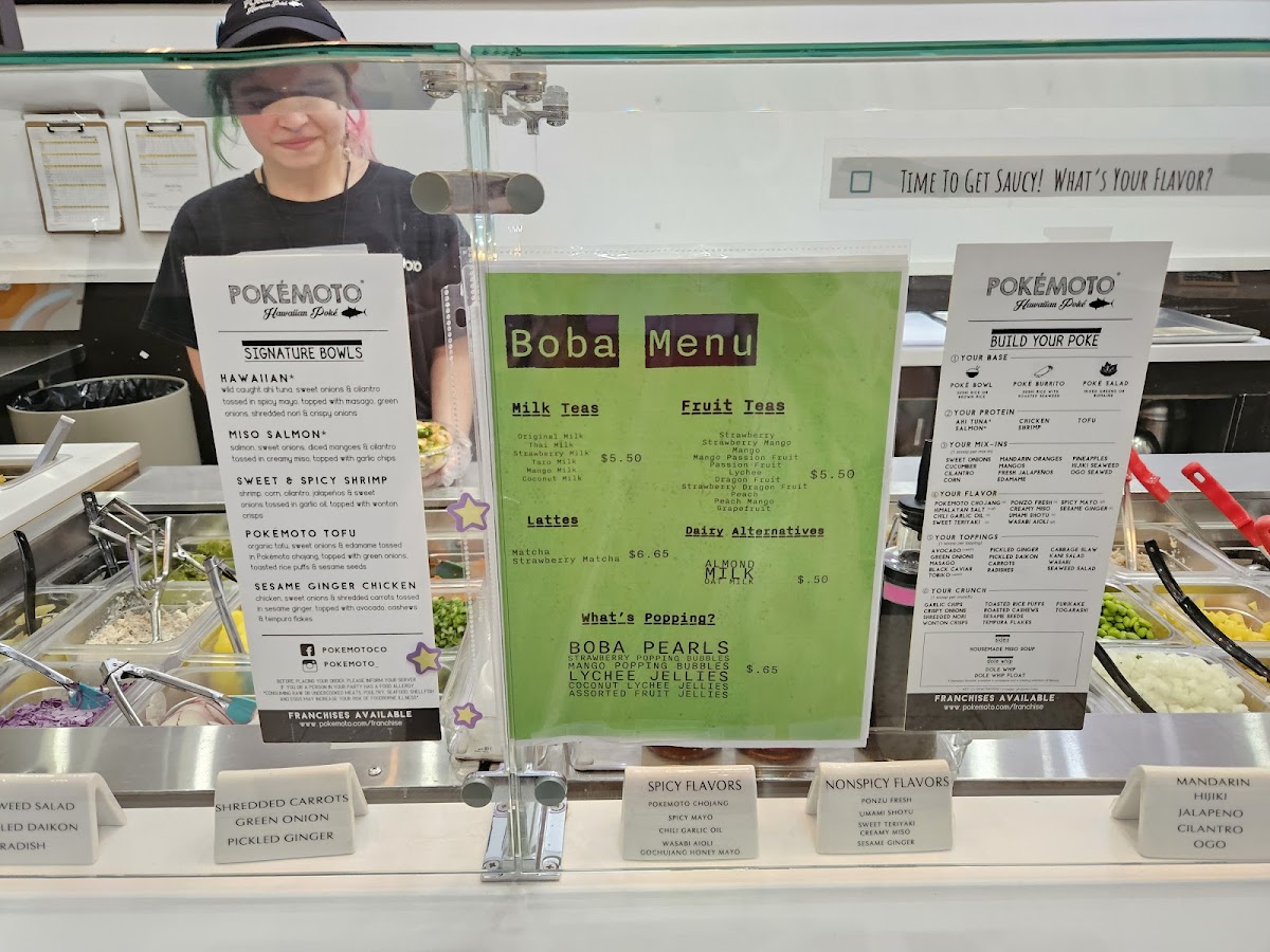 Create your own poké bowl choose your base proteins, mix-ins, flavor, toppings, and crunch.